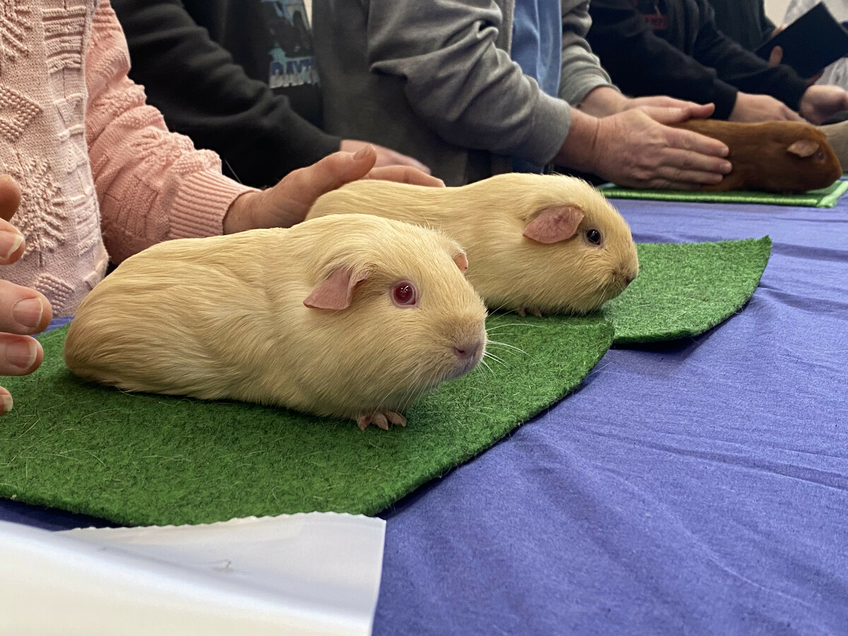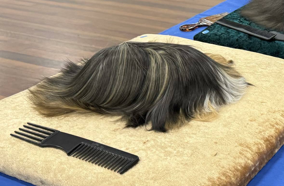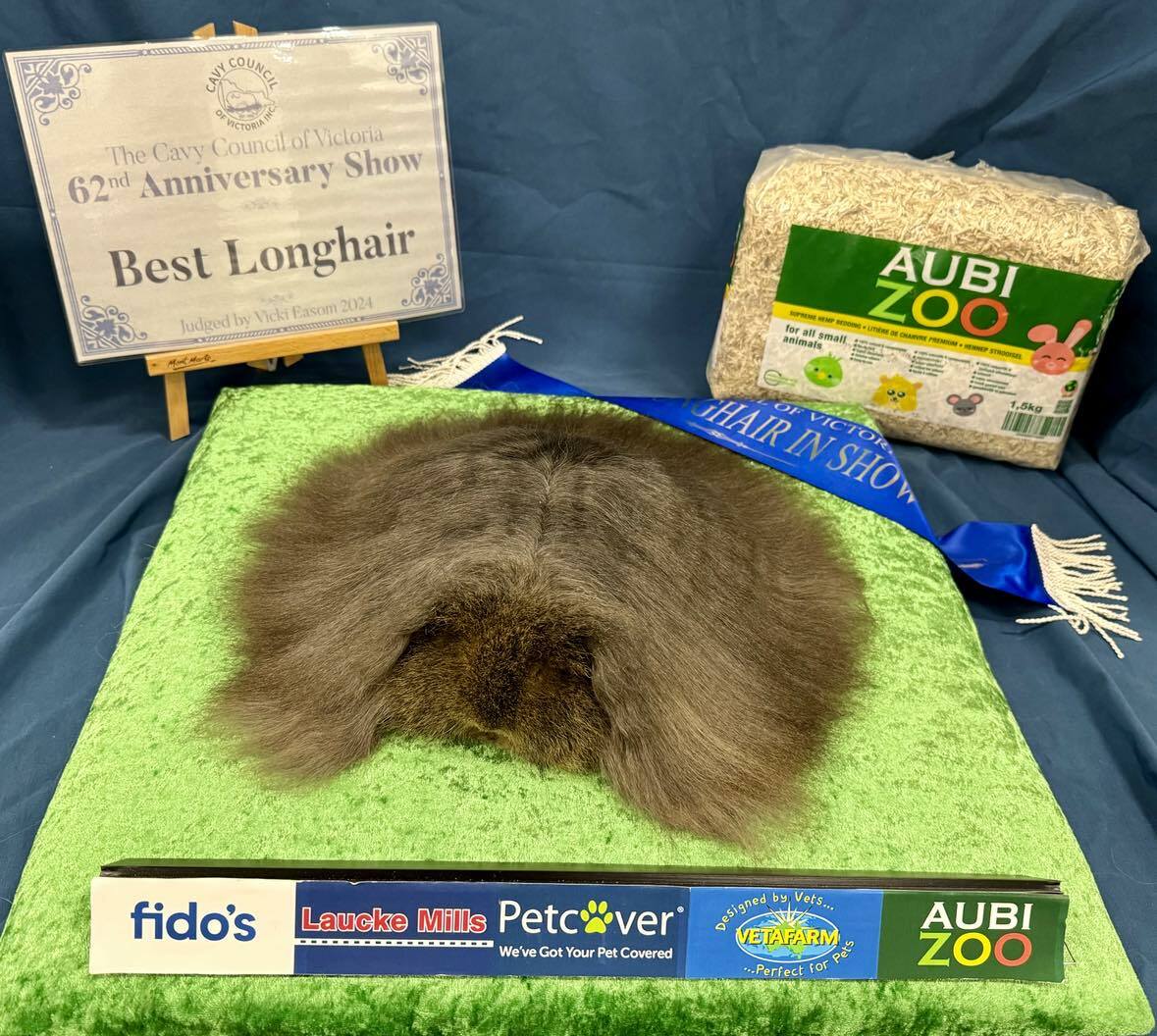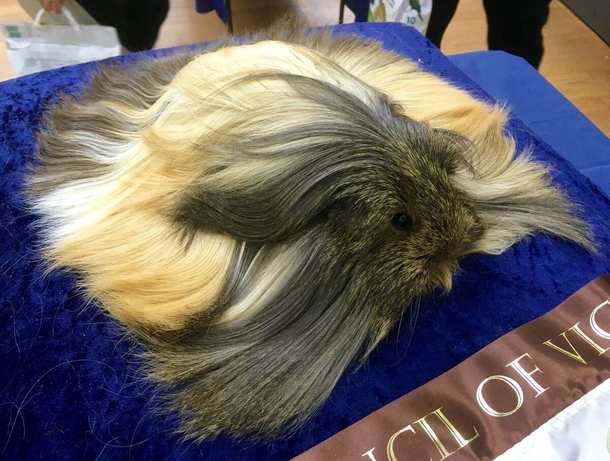Longhaired cavies in Australia are divided into seven breeds, being defined on rosette placement and hair type; rexed or straight. Longhaired cavy breeds should grow an inch of hair a month. Alpacas are a rexed coated longhaired cavy with two rosettes on the rump, pushing the hair forward so it grows around the cavy in a full even circle. Peruvians have the same rosette and hair placement but have a smooth hair gene. Texels have no rosettes on their body, resulting in their growing around their body in a U shape. Shelties are the smooth haired version of texels. Coronets (smooth haired) and Merinos (rexed hair) are the same coat presentation as a Texel or Sheltie but with a crest on their forehead. Lastly, Shebas are an Australian specific breed that are smooth haired but have multiple non-uniform rosettes creating a tousled look.